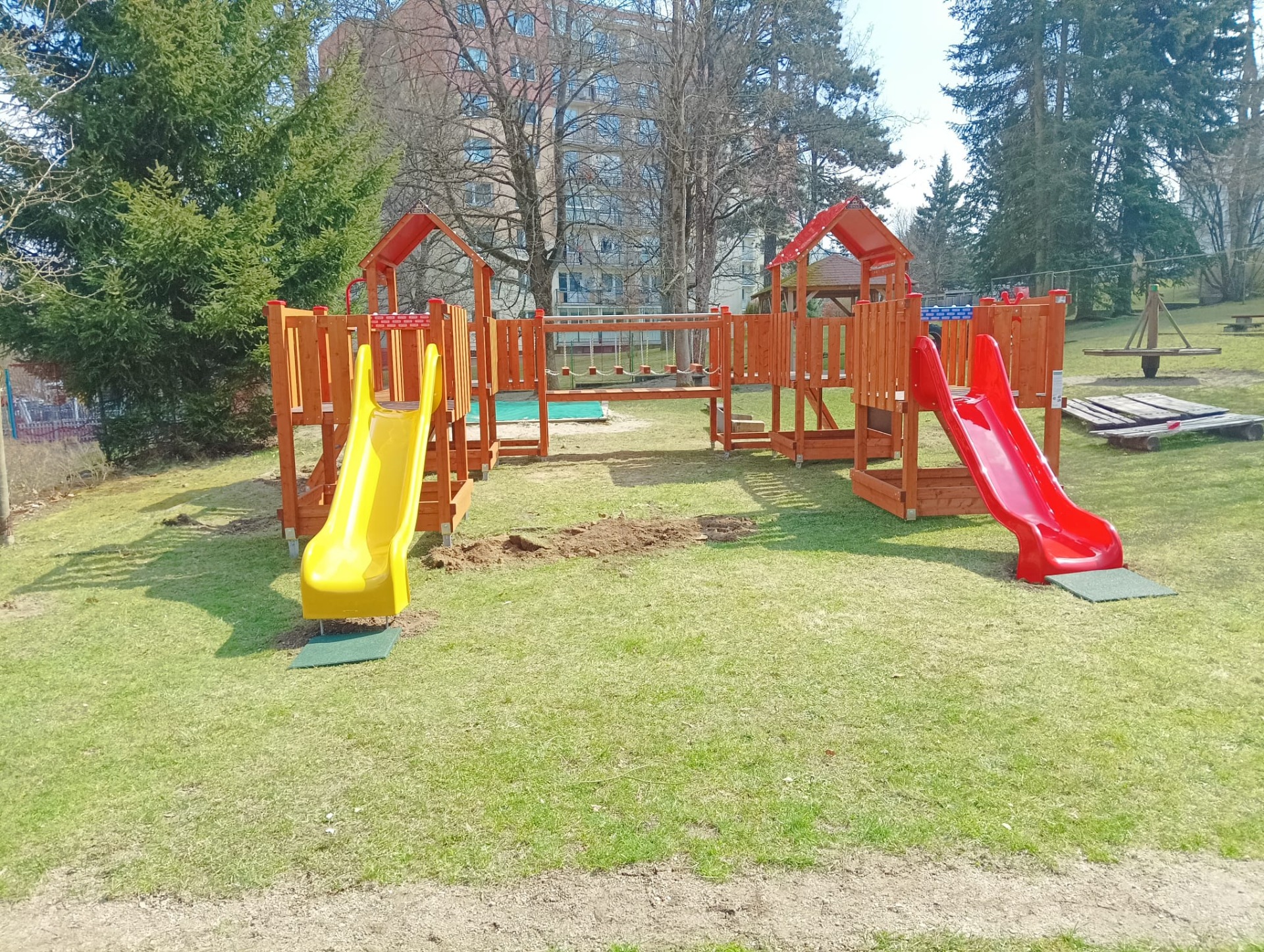 Pod sestavou bylo třeba srovnat terén do roviny, aby byly dodrženy všechny bezpečnostní předpisy. Terén si zákazník dorovnal následně sám.
