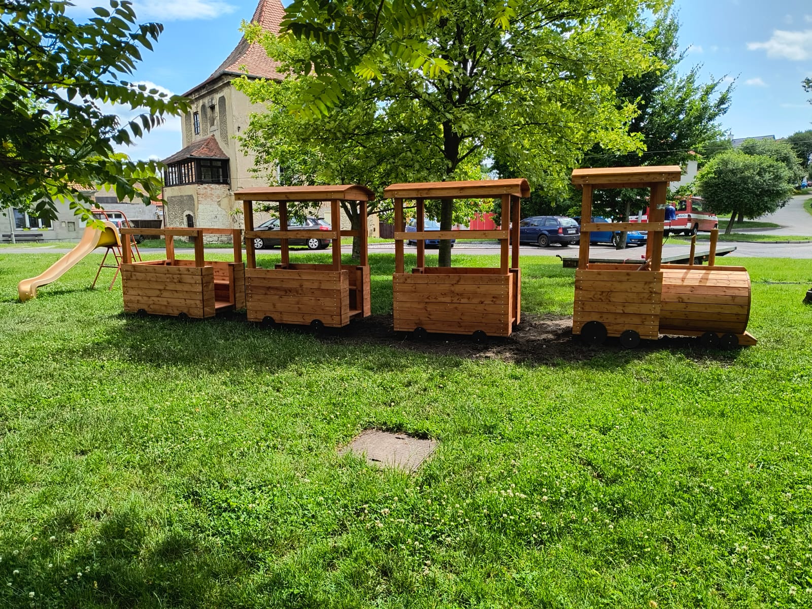 V lokomotivě a vagoncích jsou lavičky pro děti.