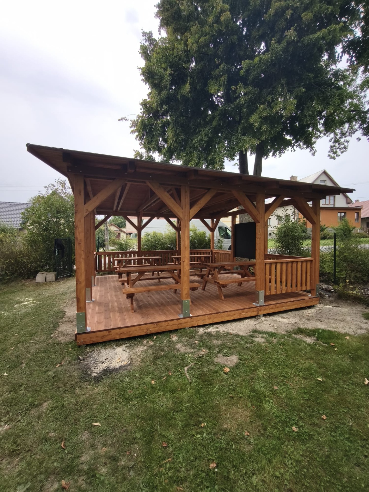 Kromě dětských sestav vyrábíme také dřevěné učebny a altány. Zde konkrétně se jedná o učebnu 5x5m.